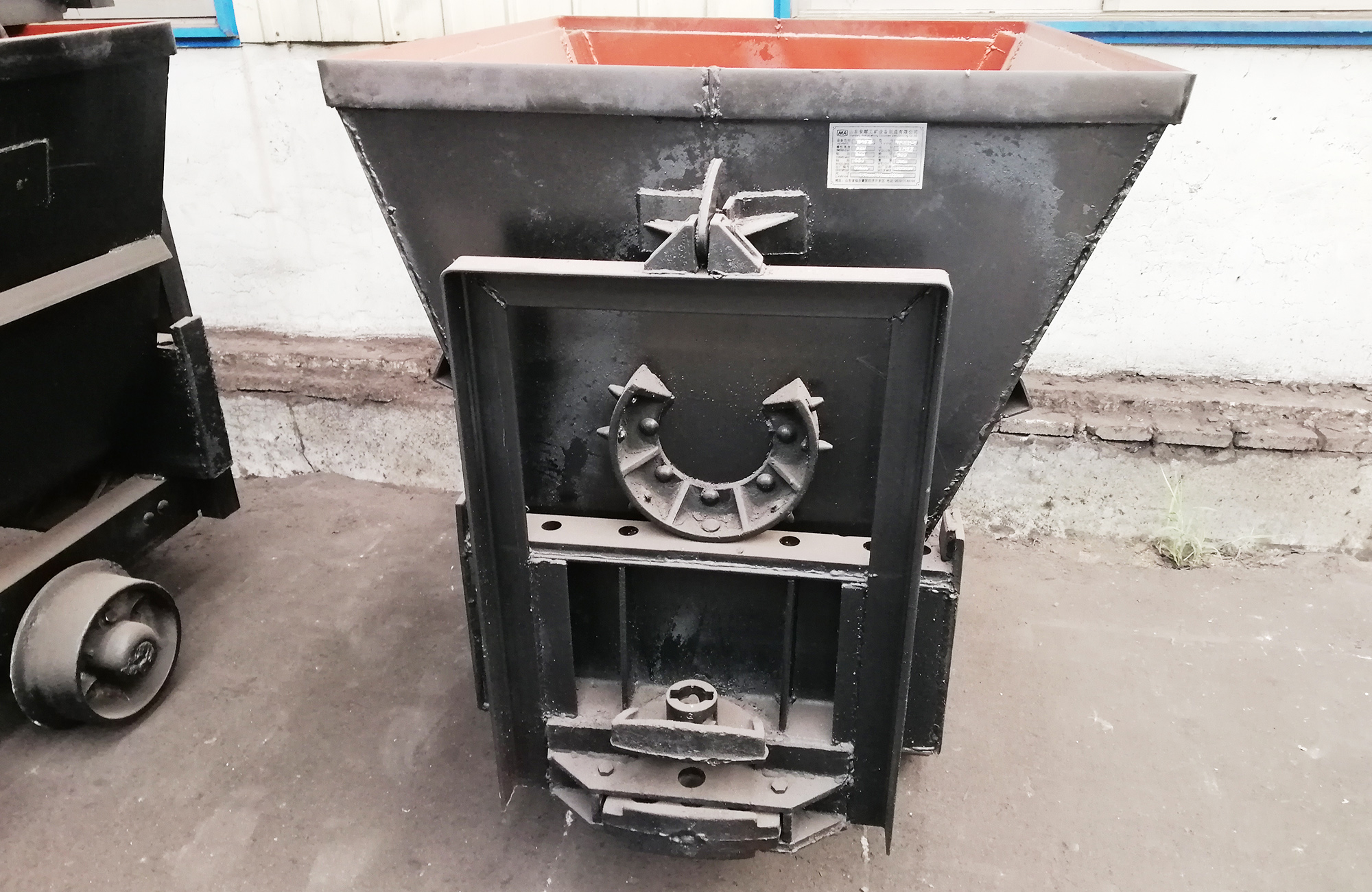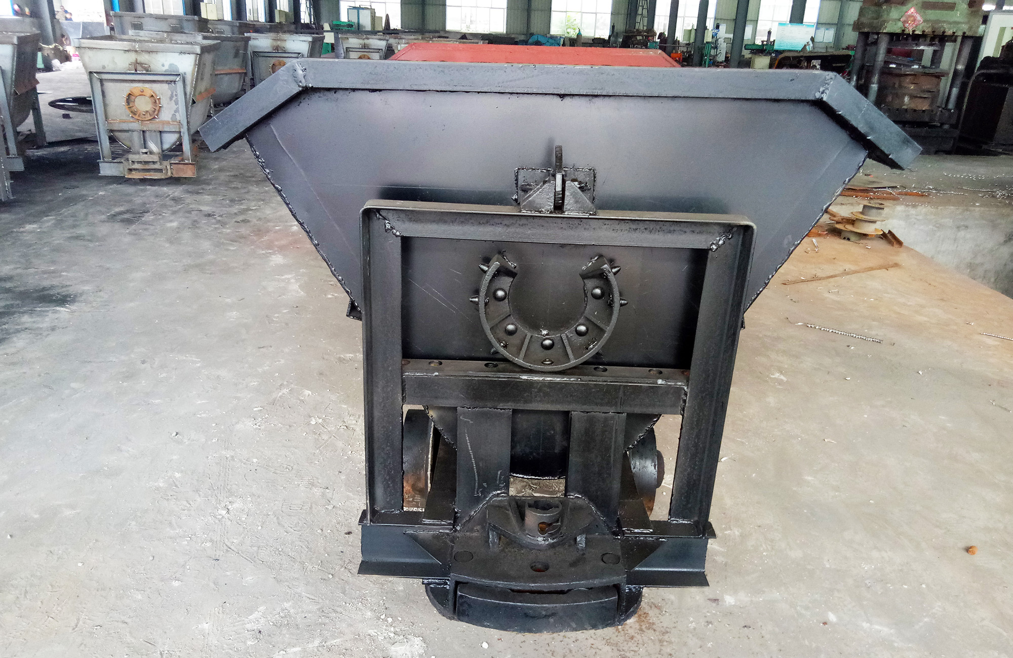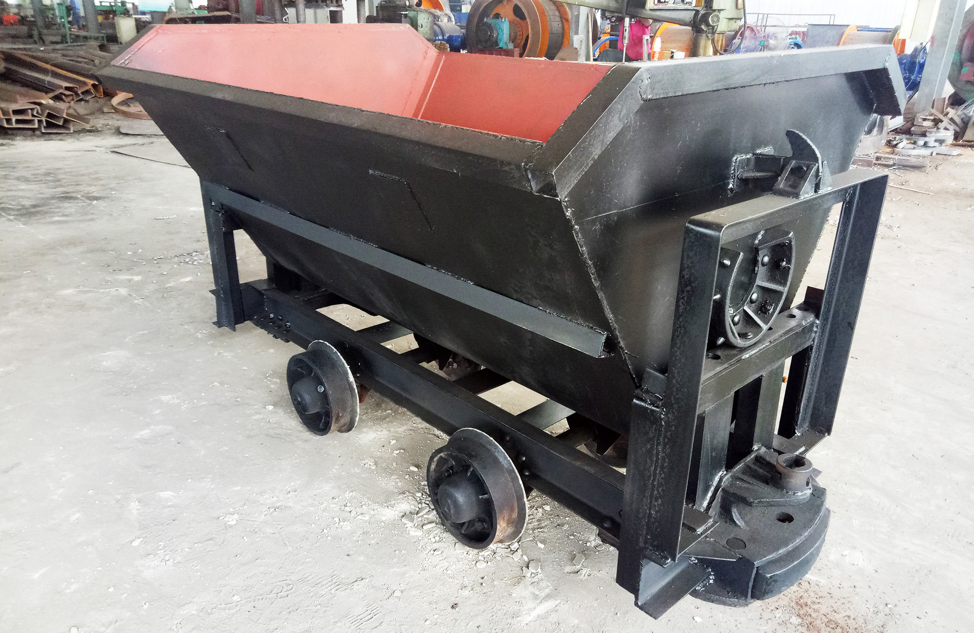 翻斗式矿车车厢断面为V型或U型,支撑在车架的翻转轨上,车厢在翻转轨上翻转卸载。由车厢、车架、缓冲碰头、轮轴等组成。结构简单,坚固耐用,使用方便,只需人力打开止动板就能很容易的卸下物料。轮轴采用了滚柱轴承,有效地减少 了运行助力,用人力即可推动。